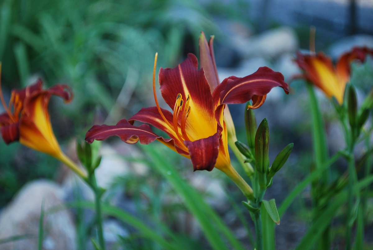 Sometimes Linda and I think the same. This red daylily came from her garden, a division I brought home last year. I had thought I brought one red daylily from her garden but as it turned out, there were two varieties that were red. Since I thought I only had one variety that was red, I expected this to be 'Stella D'Oro'. I planted it with my other 'Stella D'Oro' in a patch. My first stroke of luck was that I planted the two of these at the back of the patch since they are taller than 'Stella D'Oro'. My second stroke of luck was that the golden yellow in this variety matches the 'Stella D'Oro' quite nicely. Apparently Linda thought so too because a few days ago I noticed that one shoot coming from the middle of this plant clump was, in fact, a 'Stella D'Oro'. When I mentioned to Linda that I have no idea how one got in the middle of the other she told me that she knew how... they are planted together in her garden too! I must have gotten a bonus root piece.