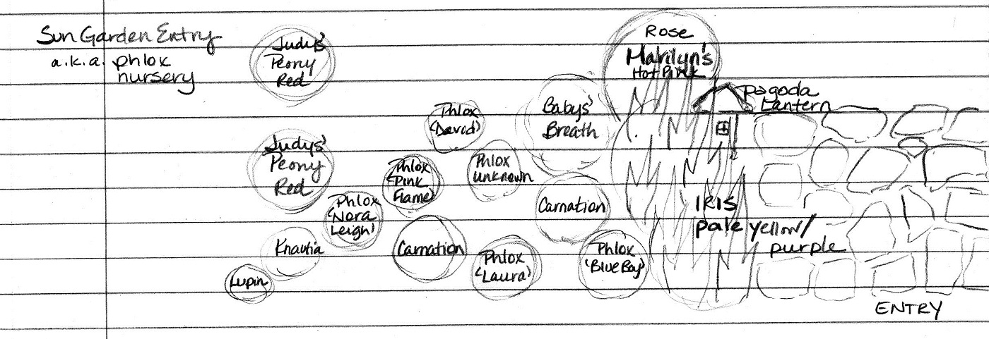 This will be the third year that Linda has sent me root divisions of her several phlox paniculata varieties. The paniculata phlox varieties are not one of my garden success stories. They seem to winter kill more often than not and they take forever to form anything that could be called a patch in my garden. The last two years, I have planted the root divisions where I would want them to permanently be situated in the garden. Last year, 'Pink Flame' and 'David' survived. With our planned move (that did not happen), the 'Pink Flame' ended up in Judys' garden. 'David' was a single stalk that was full of flowers at our sun gardens entry. This year, I have decided to change my phlox strategy. Since they remain skinny and thin for at least 2 years, I decided to plant them all together near where 'David' survived the last winter. I can protect them here, they take up very little space and grow tall so if I can keep them alive here long enough to form small patches, I will move them out to a more lasting location. I am calling it the phlox nursery and keeping my fingers crossed. Sometimes my garden can be a crap shoot... and sometimes I get lucky with that!